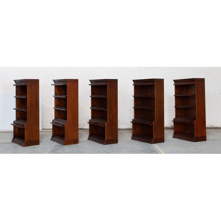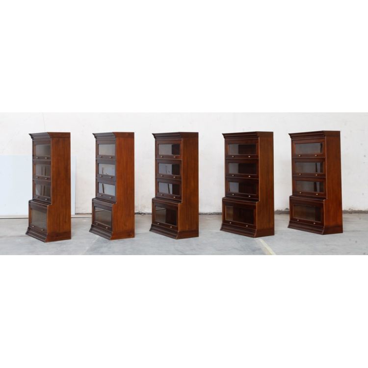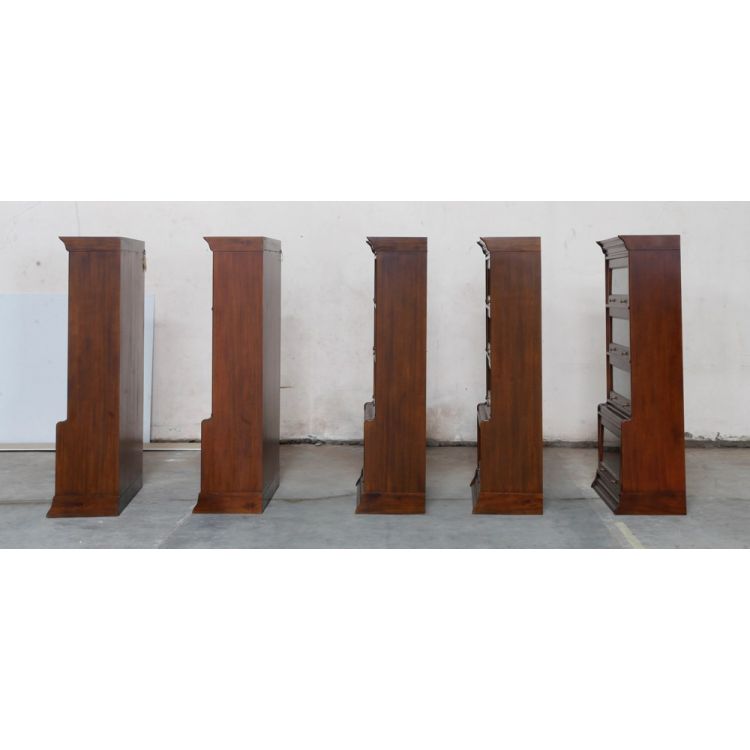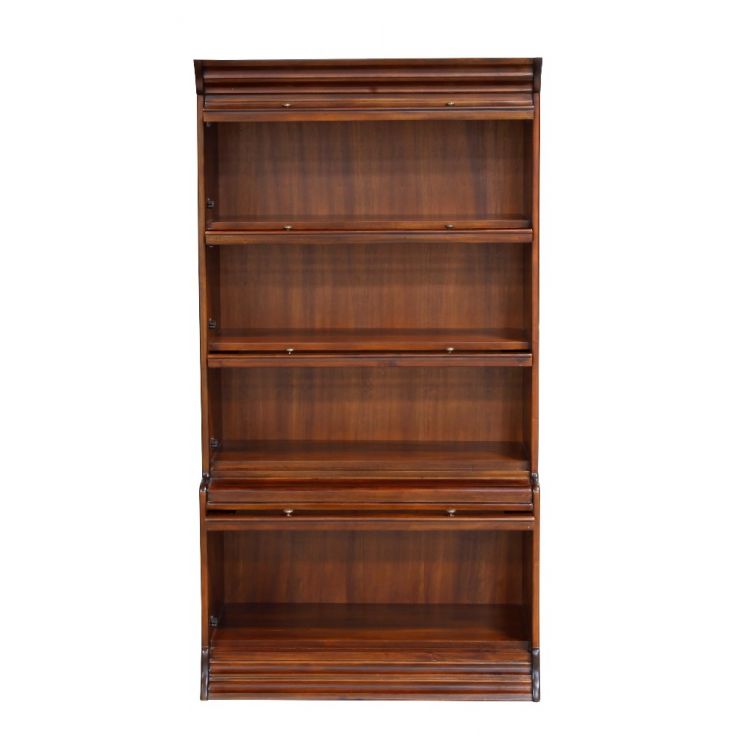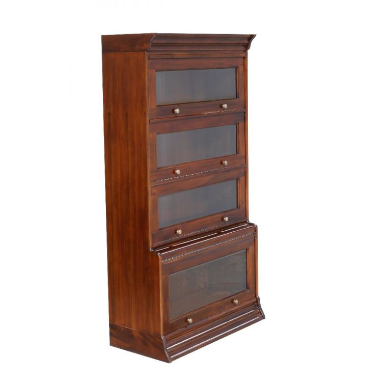 У шкафа этой модели 3 верхние полки имеют одинаковые размеры и прекрасно подходят для хранения книг наиболее распространенных форматов. А за счет увеличенной высоты и глубины нижнего отделения не только достигается возможность аккуратно поставить книги большего размера, но и придать всему изделию необычный и завершенный вид. Благодаря небольшой общей высоте, верхнюю поверхность шкафа можно использовать для размещения для предметов на уровне лица. Например, настольных часов, фотографий, шкатулок или каких-то других мелочей, которые всегда хочется иметь под рукой. Все отделения шкафа закрываются дверками в виде стекла в деревянной рамке. Дверки открываются вверх и в горизонтальном положении очень удобно задвигаются в верхнюю часть полки.