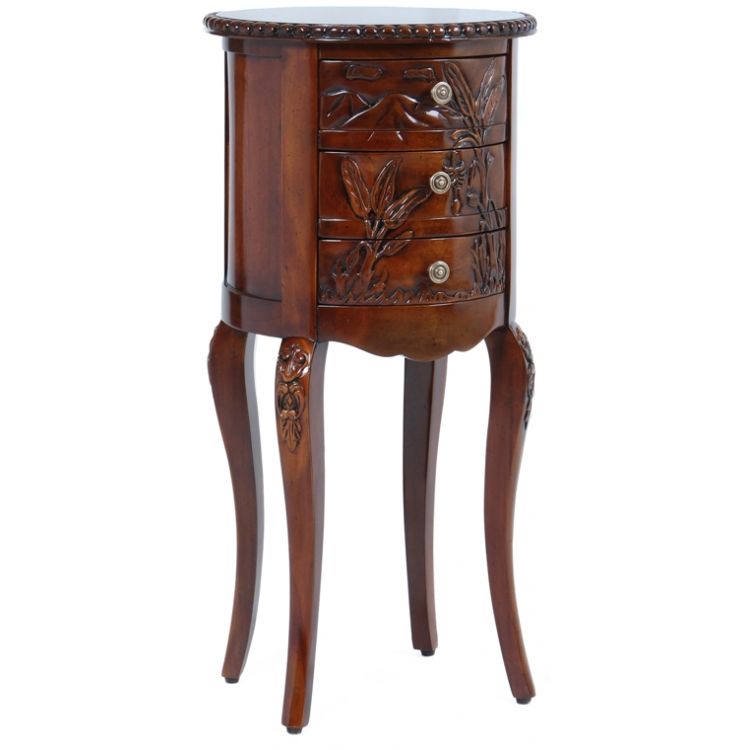 Ночной столик не зря называют миниатюрно выполненным комодом. Более того, ночные столики из красного дерева это также еще и одни из старейших предметов мебели для дома. Ночные столики предполагают и характерное основное применение как прикроватные тумбы для спальни, где им характерна роль не только дизайнерских форм, но и важной составляющей комфорта. Согласно дизайнерскому решению, ночной столик из дерева - завершающая стадия оформления интерьера спальной комнаты, вносящая в него толику изысканности. Эстетически здесь явные лидеры - ночные столики из Индонезии в стиле рококо, далеко не бедным изобилием деталей и известным вычурностью. Не посягая на значительное пространство и представляя собой предмет классической мебели, прикроватная тумбочка из красного дерева еще и многофункциональна: она знает использование и как тумба для хранения важных мелочей рядом с кроватью, или при размещении в прихожей и около дивана. Эта прикроватная тумба из массива красного дерева отличается красивым и привлекательным видом благодаря резным ножкам, трем выдвижным ящикам и кромке у круглой столешницы украшенной ручной резьбой. Вы можете приобрести у нас ночной столик по одной из лучших цен предложения.